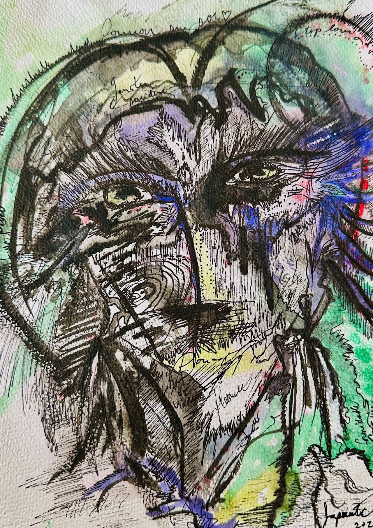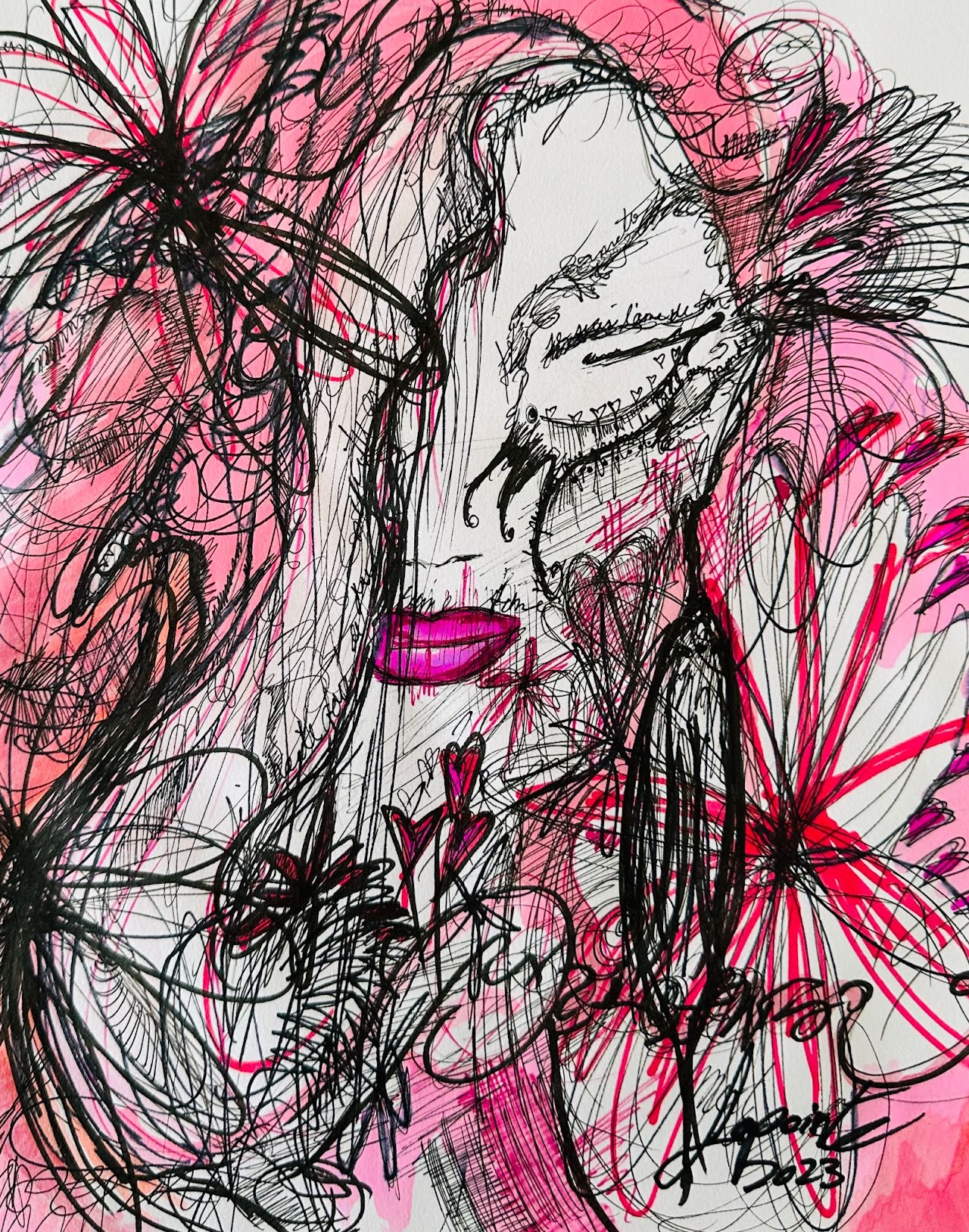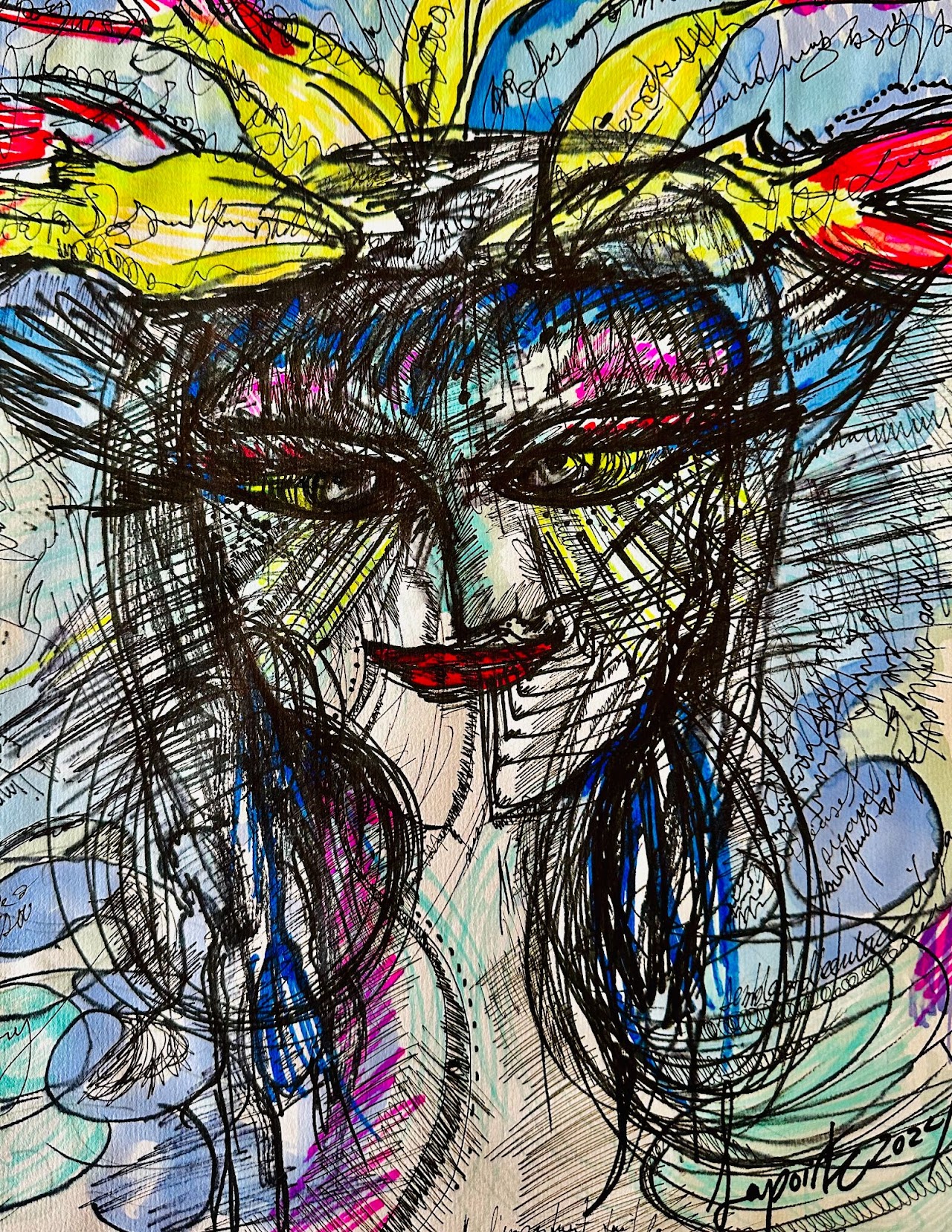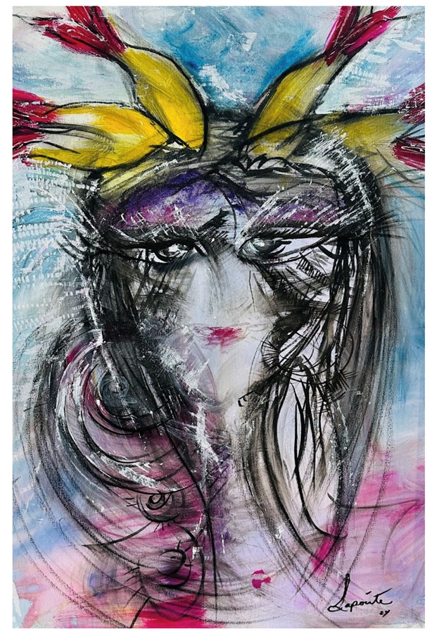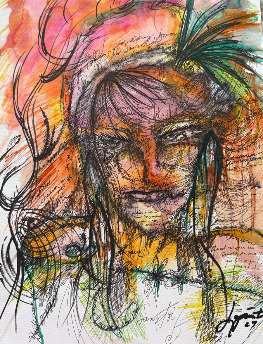 Ses œuvres explorent de manière intuitive le dialogue entre le dessin et la peinture, où chaque trait et chaque couleur contribuent à une profondeur à la fois émotionnelle et visuelle. Les hachures, utilisées comme véritable mode d’expression, insufflent dynamisme et mouvement à l’ensemble. Par cette technique, l’artiste laisse volontairement place à un geste libre, presque instinctif, qui échappe au contrôle strict du trait. Ces lignes noires, entrelacées et vibrantes, construisent la structure des visages tout en ménageant un espace ouvert à l’interprétation et à l’imaginaire du spectateur.