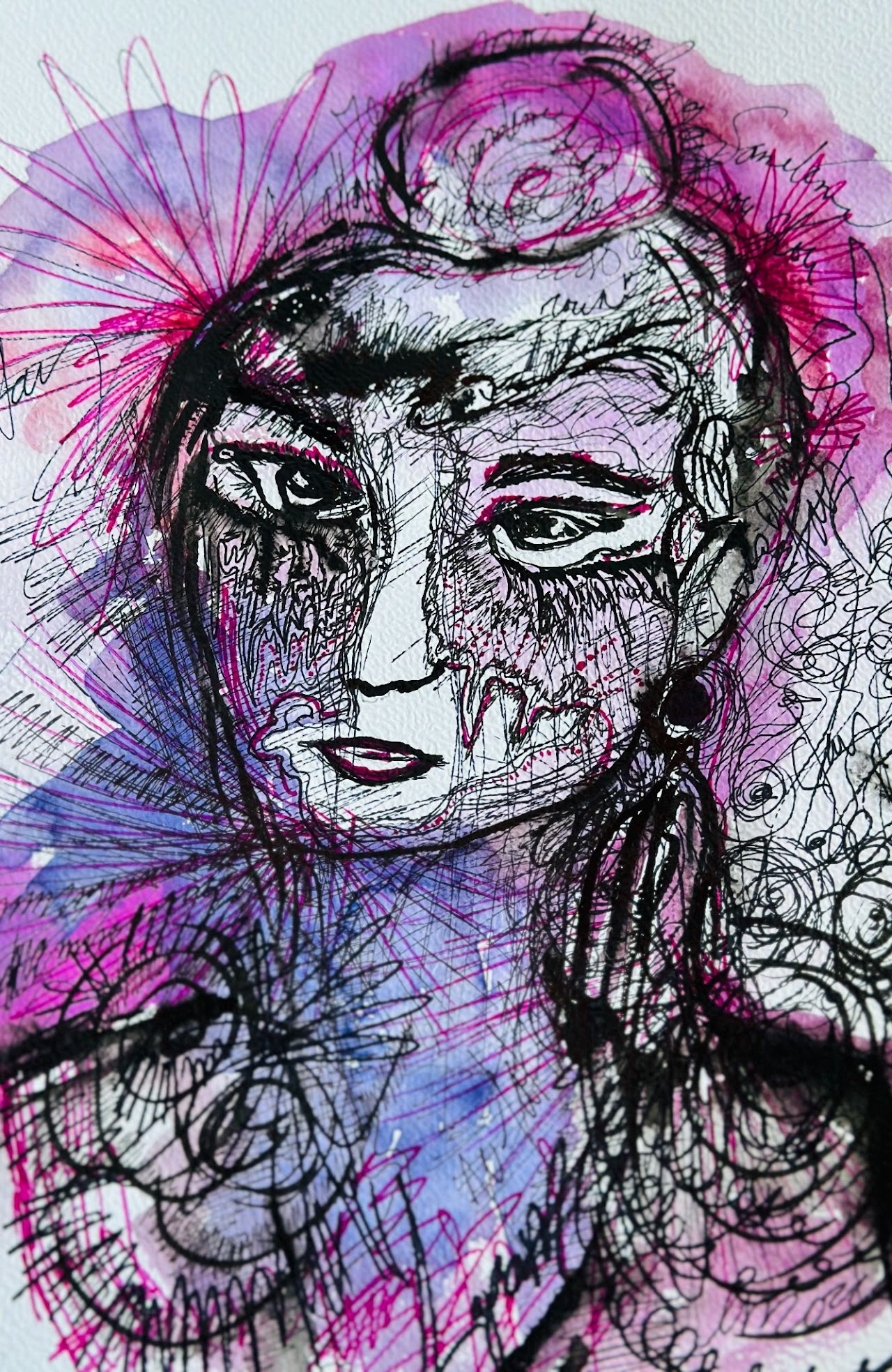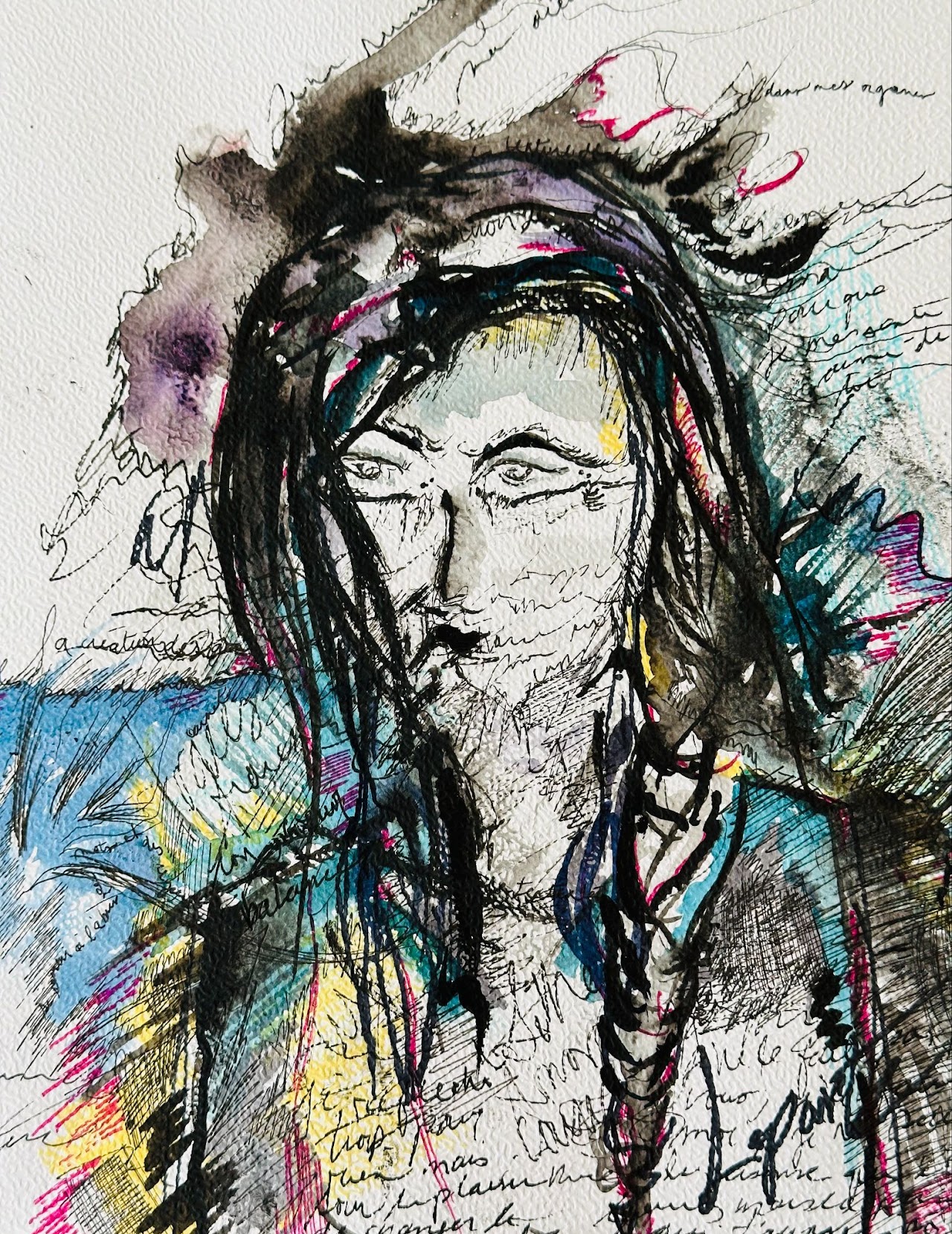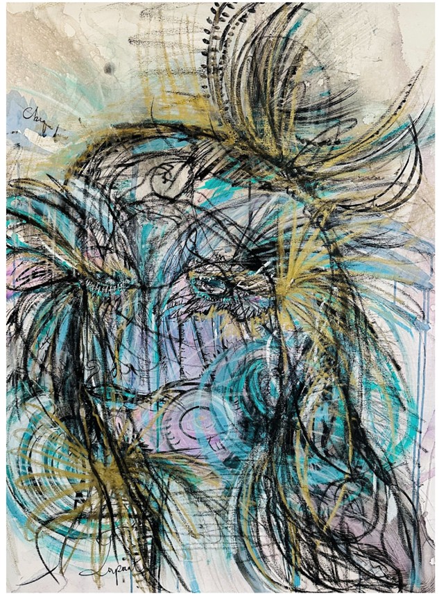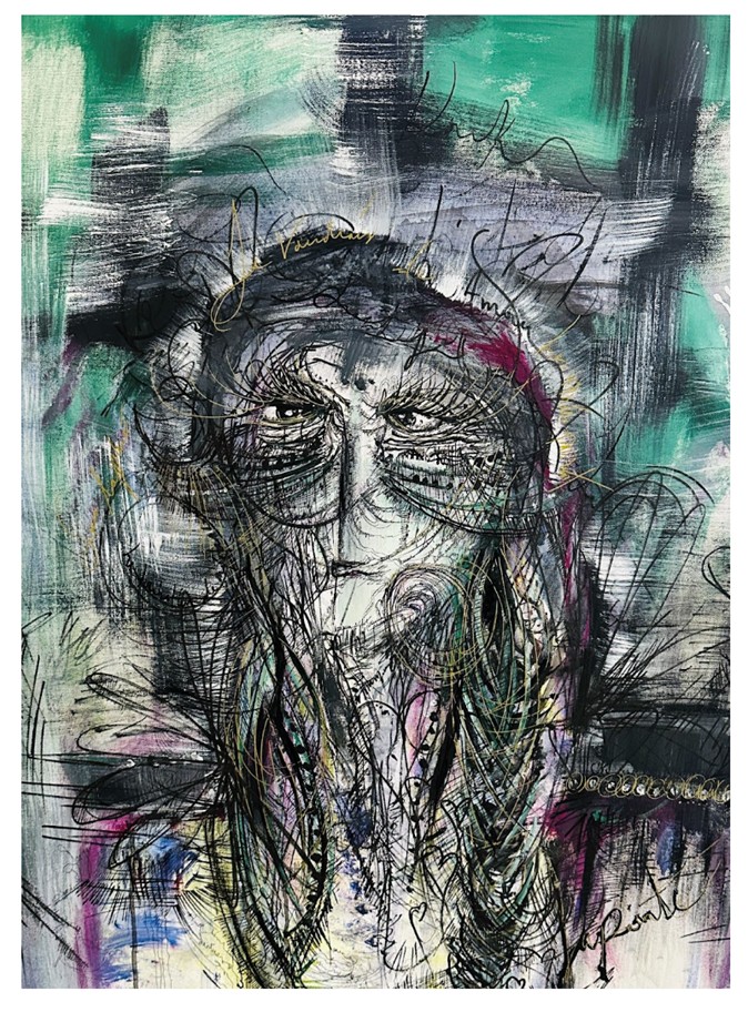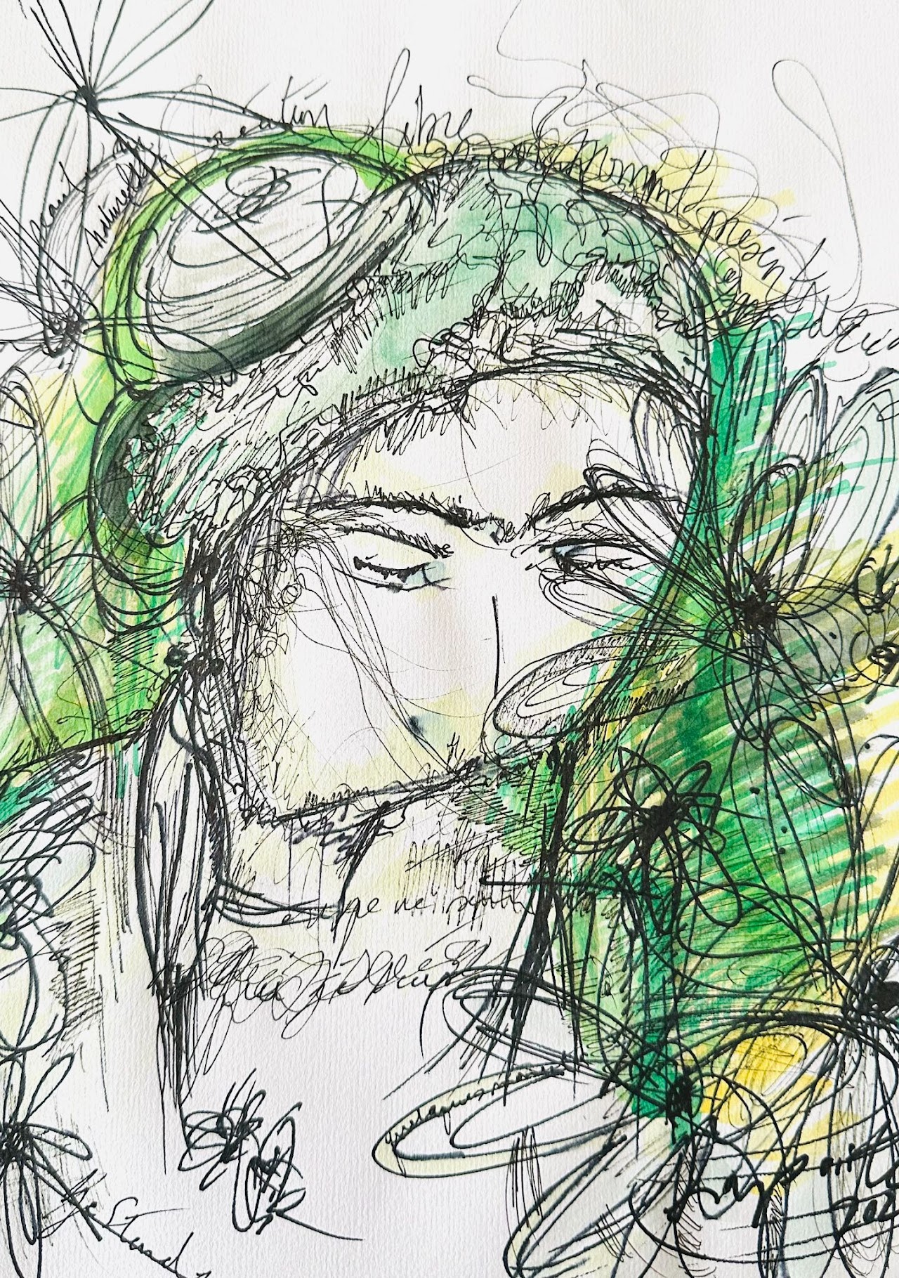 Ses œuvres explorent de manière intuitive le dialogue entre le dessin et la peinture, où chaque trait et chaque couleur contribuent à une profondeur à la fois émotionnelle et visuelle. Les hachures, utilisées comme véritable mode d’expression, insufflent dynamisme et mouvement à l’ensemble. Par cette technique, l’artiste laisse volontairement place à un geste libre, presque instinctif, qui échappe au contrôle strict du trait. Ces lignes noires, entrelacées et vibrantes, construisent la structure des visages tout en ménageant un espace ouvert à l’interprétation et à l’imaginaire du spectateur.